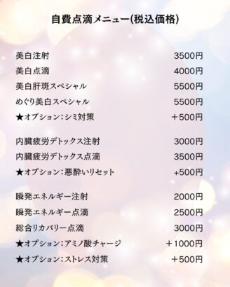 当院では5月6日から、美容系、疲労回復系、エネルギーチャージ系の3種類の自費点滴を開始いたします。メニューと料金の表です。5月の連休の疲れを即効性ある点滴で癒しませんか?また普段の疲れ対策にもどうぞ!